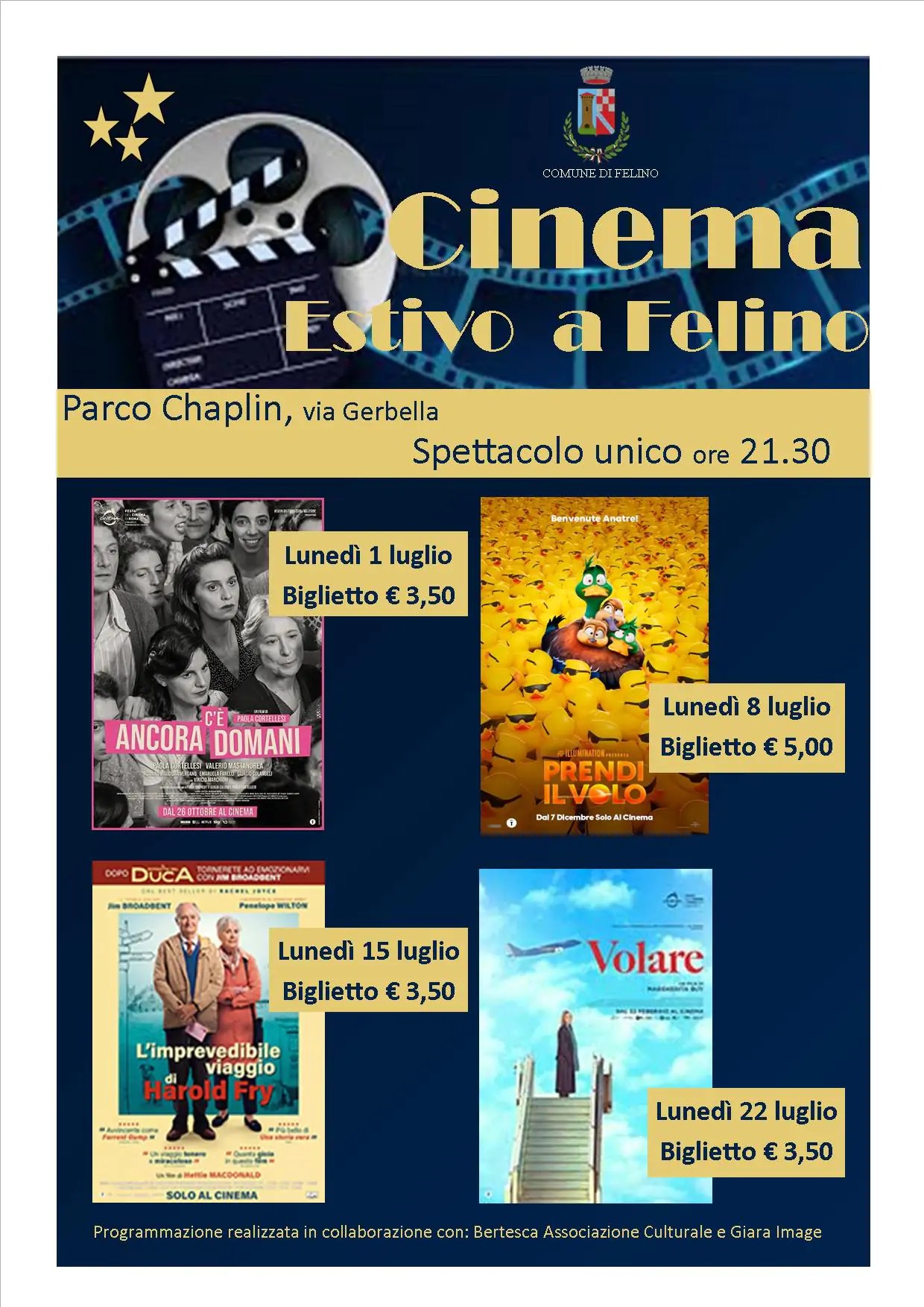 Il Comune di Felino – in collaborazione con Bertesca Associazione Culturale e Giara Image – porta anche quest’anno un’arena cinematografica estiva per i primi quattro lunedì di luglio, nella cornice del Parco Chaplin (Via Gerbella).